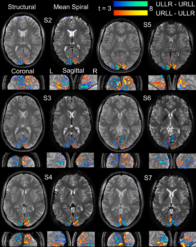 Figure 7: Mean spiral images and activation maps over subjects (S2-S7) for high-resolution spiral-out fMRI.