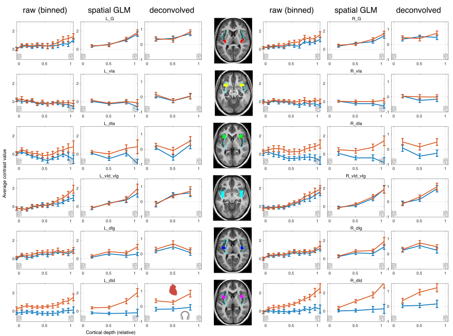 Voxel-wise analyses reveal increased activity in the bilateral dorsal mid-insula during interoceptive attention (attending to one’s heartbeat) compared to exteroceptive attention (attending to auditory white noise). Layer-specific analyses further demonstrate that this difference in activity is significantly higher in upper compared to lower cortical layers. This activation pattern persists after accounting for potential vascular artifacts through a deconvolution analysis with a physiological point spread function (PSF).